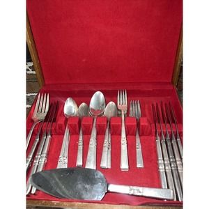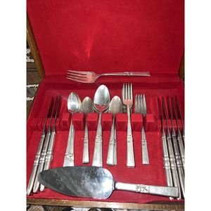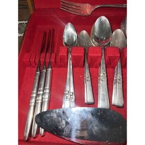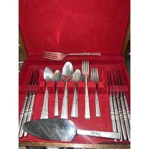 This vintage Oneida Community Morning Star silver plate flatware set includes 50 pieces of various flatware, perfect for adding a touch of Art Deco style to your collection. The pieces are crafted from silverplate and feature a beautiful pattern that adds charm and elegance to any table setting.