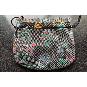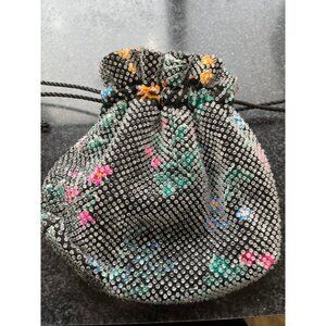 Vtg 1950's Candy Dot Beaded Drawstring Handbag Clear Colored Bakelite Beads Black Floral Pattern Fully Lined