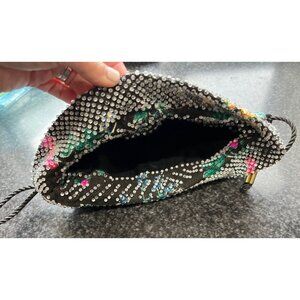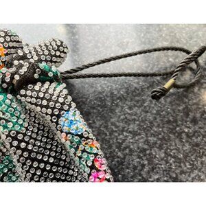 This purse is just phenomenal. Black fabric background with beautiful bursts of colored floral arrangements. The inside of the purse is fully lined with solid black fabric. The clear candy dots that cover the purse are outstanding. Gorgeous, sophisticated look.