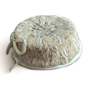 This round “pancake” / beret-style cocktail hat features an ivory satin base topped with intricate metallic lace embroidery and hand-sewn iridescent sequins that shimmer beautifully in the light. A matching satin bow trims one side, adding extra charm.