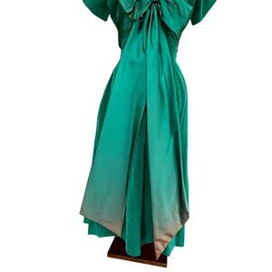Vtg 1950s Kay Selig Emerald Green Velvet Evening Tea Length Dress Satin Bow Back