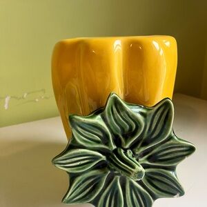 Charming yellow ceramic jar shaped like a pepper. Features a green lid with leaf design.