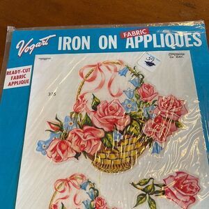 Vtg 1953 new in packaging Vogart iron on appliqués pink roses floral baskets