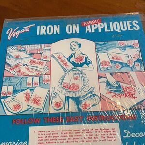 Vintage 1953 new in packaging Vogart iron on fabric appliqués pink roses floral baskets