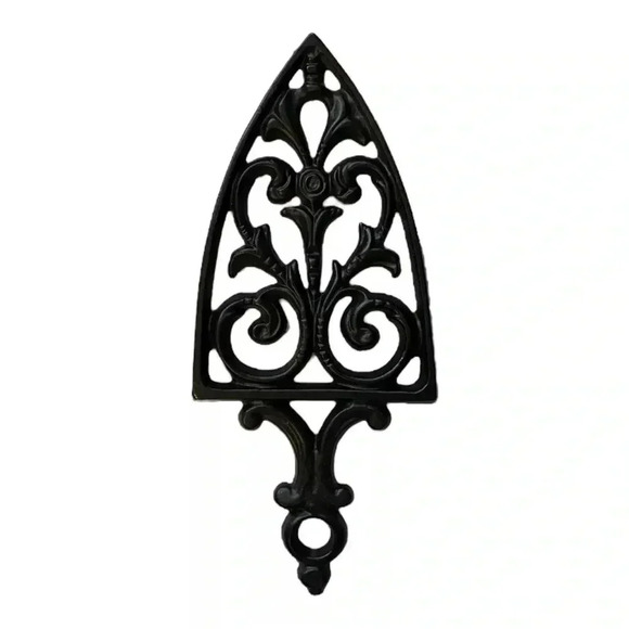 The triangular shape with a scroll pattern is perfect for all occasions and adds a country style to your decor. This trivet is oven safe and has a handle. Measuring 9 inches long and 4 inches at widest point, it is the perfect size for small pots and pans. Crafted in the United States in 1955 and is the Cathedral T-12 model.