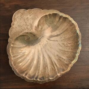 Lovely shell-shaped dish/trophy from a 1955 golf tournament. Beautiful patina. Reads “Second Winner All Member Handicap Tourney MCAS El Toro 1955”. Beautiful vintage shell design. Measures 12” x 12”.