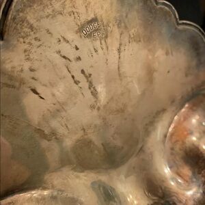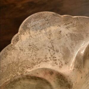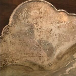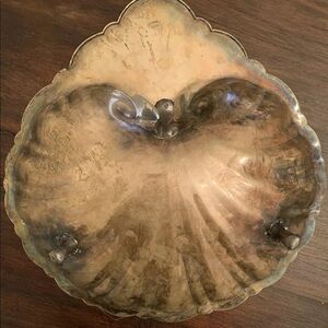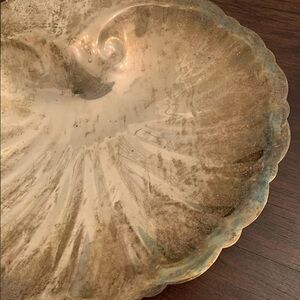 Lovely shell-shaped dish/trophy from a 1955 golf tournament. Beautiful patina. Reads “Second Winner All Member Handicap Tourney MCAS El Toro 1955”. Beautiful vintage shell design. Measures 12” x 12”.