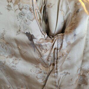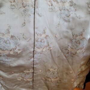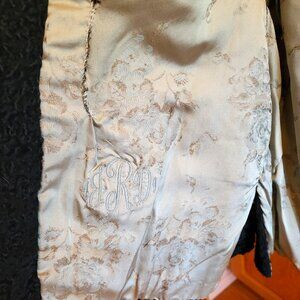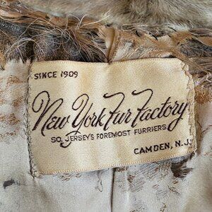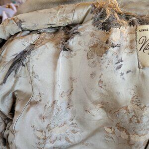 There are pockets on the front of the jacket with cuffs on the sleeves. There is a shawl style collar of grey mink fur. Inside label is New York Fur Factory, Camden, New Jersey. The jacket is fully lined by a soft satin fabric with a floral design. The jacket has a loop closure in the front. There is embroidered initials on right inside of “’JRD.” The lining is damaged in some areas, by the neck line and around arm openings. See all pictures for more details.