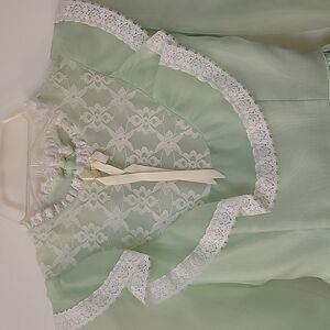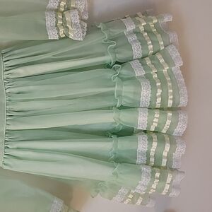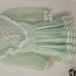 The Vtg 1960s MARTHA'S MINIATURES Chiffon Lace Bow Tie-Back Lolita Dress is a delightful vintage find! It features a chiffon fabric adorned with lace detailing and a charming bow tie-back design, reminiscent of the Lolita fashion style. This dress would have embodied the feminine and romantic aesthetic popular in the 1960s, making it a timeless and elegant piece for any vintage enthusiast's wardrobe.