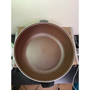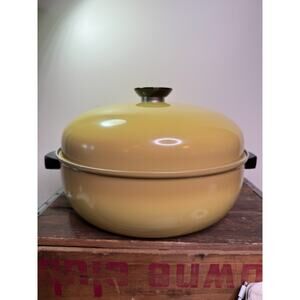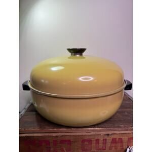 The product is a vintage 1960s Regal Ware aluminum 5.5 Qt pot Dutch oven roaster, made in the USA. This three-piece set includes a round Dutch oven with a 12.75" diameter, a lid, and a steamer. The pot is of gold color, with a capacity of 5.5 quarts and a depth of 4 inches. It is designed for use on both electric and gas stoves, and features non-stick Teflon coating, easy cleaning, and double handles. This collectible cookware piece is a unique addition to any kitchen, representing a piece of American manufacturing history.