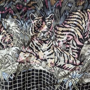 Ivory and black midi length 100% cotton diamond windowpane plaid print house dress with an illustrated tiger design along the hemline, front zip entry, and a tie at the neckline, from Smart Time. Vintage circa the 1960s. Excellent gently used condition.
