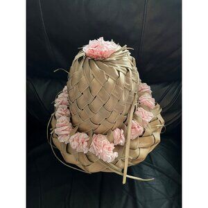 Vtg 1967 Hat Women’s Pink Hawaiian Handmade Palm Frond Woven 7″ x 10 1/2″ Handwoven Made In Hawaii