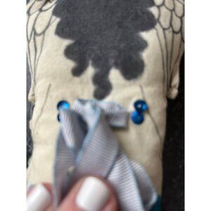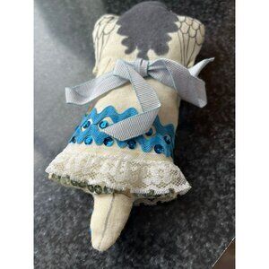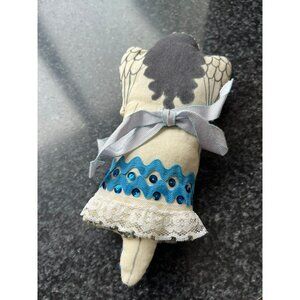 This charming Christmas ornament/angel/doll is just precious. Handmade and hand painted. This sweet angel is beautiful in silver, green & blue sequins that adorn her dress. The halo is silver sequins. Her necklace is made with blue nd silver sequins.. She has gold and blue bric brac with white lace the hemline. Her wings are hand painted with blue sequins. A blue grosgrain bow tops off the front of her dress at the neckline. The shoes are blue sequins. The back shows off her long black, wavy hair. Another blue grosgrain ribbon and bow completes the back.