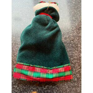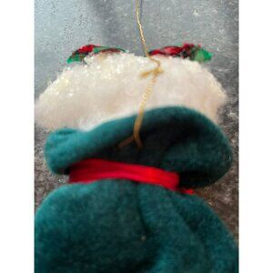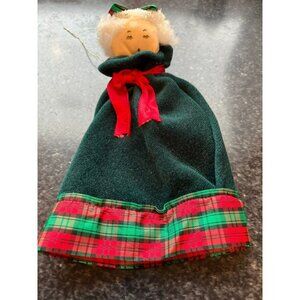This charming Christmas ornament/doll is just precious. Handmade and hand painted. This sweet girl has a wonderful outfit on of green velvet, red ribbon and green and red plaid ribbon. The hair is crunching fabric that sparkles with a plaid bow in her hair. Her eye lashes are long and lovely. She has a gold thread for hangind.