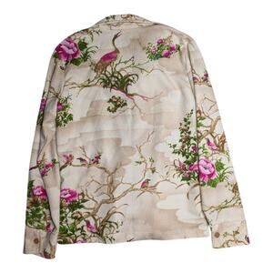 Ivory 100% polyester button up collared top with a pink and green floral, branch, and Japanese crane print, from Georgee Originals.