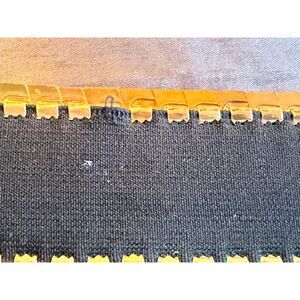 This vintage gold-tone stretch belt from the Made in Hong Kong era (circa late 1960s–early 1970s) features a beautiful scale-textured metal design and a bold floral-accented clasp at the center. The flexible black elastic back allows a comfortable fit for waist sizes around 30 – 34 inches.