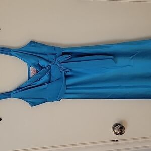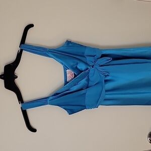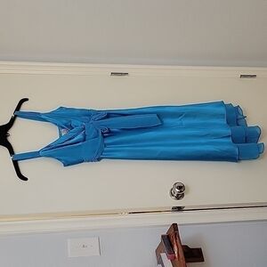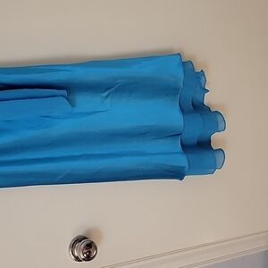 100% Polyester. Made in the USA. Zips on the side. 1970s to 1980s Vintage formal dress. Dark turquoise color.