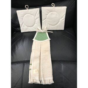 Two pot holders 8" x 7 1/2" with an artichoke and one dish towel with the same pattern at the top and 4 artichokes approx. 20" x 14".