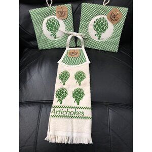 Vtg 1970's Set Of Three Artichoke Kitchen Works B & D Dish Towel With 2 Matching Artichoke Pot Holders NWT