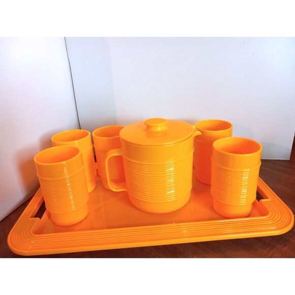 For sale is a Vintage Rubbermaid Pitcher Set from the 1970s. It is made of yellow melamine plastic and consists of a 1.5-quart pitcher, 6 plastic tumblers, and a serving tray. The tray measures 11" x 18" and features cutout handles for easy carrying.