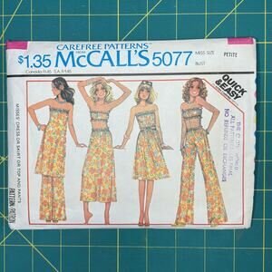 Create your own vintage-inspired wardrobe with this 1976 McCall's sewing pattern! This pattern (number 5077) includes designs for a dress, skirt, top, and pants in Misses' Petite sizes 6-8