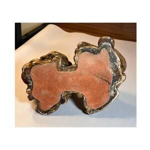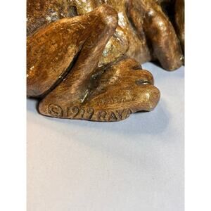 This is a charming vintage 1979 “Beasties of the Kingdom” dog figurine by John Raya. Crafted in a humorous, exaggerated style, this sculpted piece features a floppy, tired-looking dog—possibly inspired by a basset hound—with detailed facial expression and textured fur. Marked © 1979 RAYA on the foot, this collectible sculpture is part of the early whimsical work by artist John Raya.