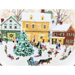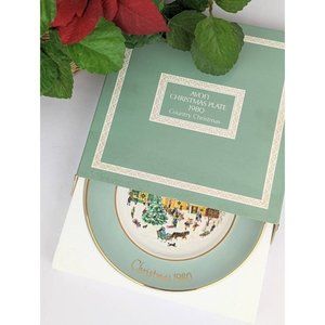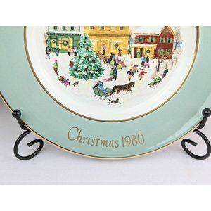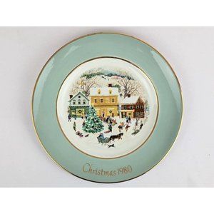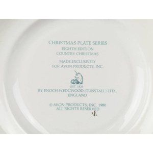 This plate is the eighth edition of the Christmas Plate Series from Avon manufactured by Enoch Wedgwood, England in 1980. It would be the last plate manufactured by Wedgwood as production would move to Japan in 1981. The plate measures approximately 8.75 inches and is trimmed with a lovely gold band around the edge. The border is a blue hue and the words "Christmas 1980" are written in gold on the bottom of the plate. The image in the center of the plate is a wholesome scenery of two people riding in an open horse drawn carriage through a town scene in the foreground. In the background are three farmhouse buildings in lovely colonial reds, blues and yellows. A holiday tree decorated with ornaments stands in the middle of the town square with people milling around. The colors on the plate are vibrant and look fresh. You'd hardly know the plate is nearly 50 years old. The plate has been stored in its original box and is in excellent vintage condition with no chips, cracks or crazing. Would make a perfect addition to a Christmas nostalgia or vintage collection. Also, perfectly gift-worthy and would be a unique choice as a gift for someone born in 1980.