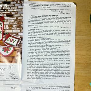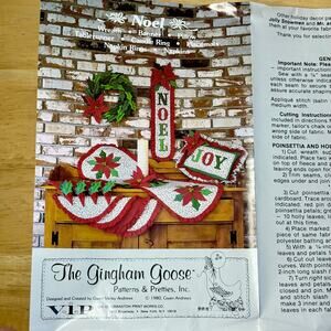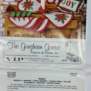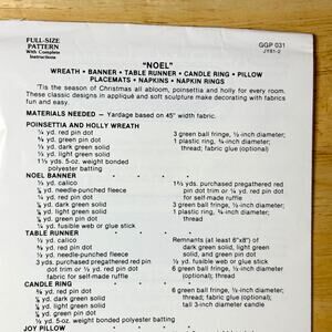 Bring festive charm to your holiday décor with this vintage 1980 sewing pattern by The Gingham Goose (VIP). This pattern includes instructions to create a NOEL banner, JOY pillow, wreath, table runner, candle ring, placemats, napkin rings, and napkins—perfect for adding a handmade touch to your Christmas home décor.