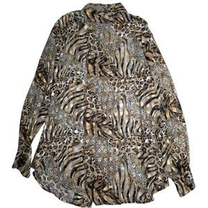 Vtg 1980s Dion Tan Black Sheer Textured Leopard Zebra Print Button Up Top XL