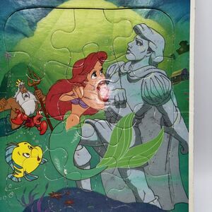 The product is a vintage 1980s Golden Arial The Little Mermaid Frame Tray Puzzle 4911A from Walt Disney. This puzzle features characters and themes from the popular Disney movie, The Little Mermaid, and was manufactured in the United States. Perfect for collectors of Disneyana and vintage toys, games, and puzzles, this piece of memorabilia captures the charm and nostalgia of the beloved franchise.