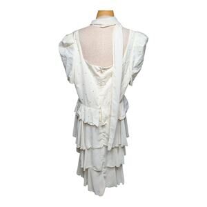 Ivory short sleeve midi dress with a square neckline, faux pearl bead embellishments, puffy shoulders, and a tiered skirt, from Michael Maiello for Pat Richards. Includes matching scarf.