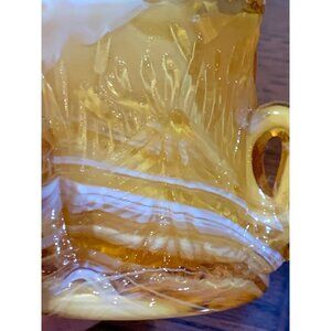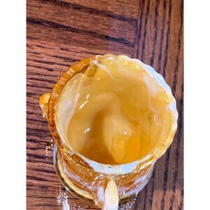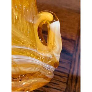 Look closely at the two "handles" on the toothpick holder as they are actually swan heads. This toothpick holder is glass in a butterscoth color with white spun throughout for a wonderful slag effect. Measures 2 3/8” tall, 2 1/8” dia.