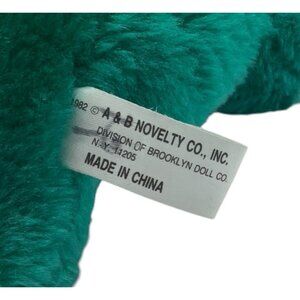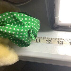 This vintage plush bunny by A&B Novelty Co. features soft yellow fur with a green polka dot hat and tie. Made in 1992, it is perfect for collectors or as a unique gift.