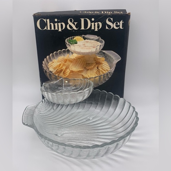 This is a vintage 1983 Leonard Chip & Dip Serving Set in a large clear shell shape with a scalloped edge. Each includes a single compartment for serving, with a diameter of 11" for the larger dish and 6" for the smaller dish. The set is made of glass, features handles, and is designed with a triple footed bottom. This elegant serving set is perfect for various occasions and various complementary snacks like potato chips, tortilla chips or vegetables with dip such as salsa, guacamole or creamy dips and is easy to fill and refrigerate. Excellent Vintage Condition!
