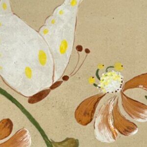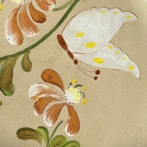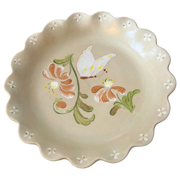 This lovely vintage 1985 handpainted fluted stoneware pie plate features a pretty butterfly flitting about two flowers. The edge is ruffled and there is a small white flower painted in the center of each ruffle. This is a solid oven-safe baking dish you can use to bake and serve pie, veggies, potatoes au gratin, quiche or whatever you can imagine. It is beyond charming!