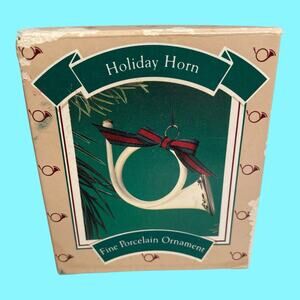 Vintage Hallmark 1886 Holiday Horn Fine Porcelain Christmas Ornament in Original Box.