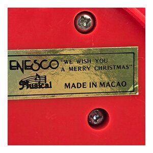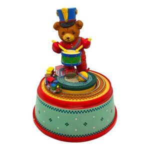 This charming Enesco musical figurine features a bear in festive attire playing a drum. Made in 1988. Music Box plays the song "We Wish You A Merry Christmas" when the key is wound on the bottom and the toggle switch is moved on the side. Music Box is wind-up powered, no batteries necessary. A delightful collectible that adds a nostalgic touch to holiday decor.