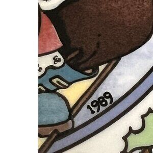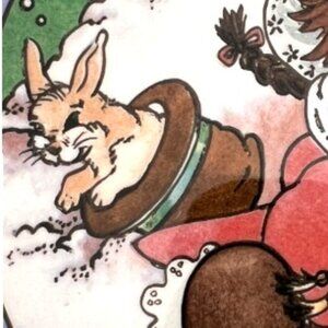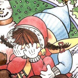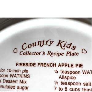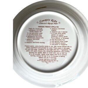 This vintage 1989 Watkins Country Kids Collectors Pie Plate features the fantastic recipe for Fireside French Apple Pie. The front depicts two country kids sledding down a snowy hill. The girl sits in front and covers her eyes, her braids flying in the wind, while her brother holds on to her from behind. A smiling snowman stands in the background with a bunny hopping out of his hat. Surrounding the scene is a charming border of ivy or holly.