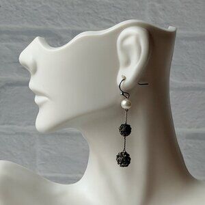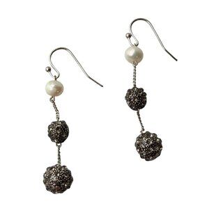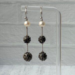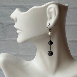 These 1990s Chico’s earrings combine classic elegance with a modern twist, featuring a creamy faux pearl leading into a slender chain and two sparkling textured metal spheres. The tiered drops move beautifully when worn, adding shimmer and sophistication without feeling heavy.
