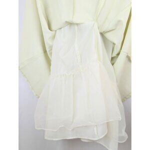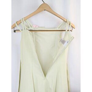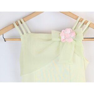 This charming vintage 1990s formal dress in mint green is perfect for any special occasion. Featuring delicate spaghetti straps and a crinoline-lined skirt, it has just the right amount of fluff and fullness. The bodice is adorned with a tulle and fabric flower accent, adding a timeless, romantic look that’s ideal for a flower girl, church ceremony, or middle school graduation. The dress also includes a convenient zipper closure at the back, along with two short tie straps for added detail.