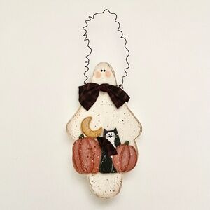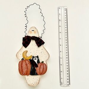 Vtg 1990s Halloween Ghost Door Hanger with Pumpkins and Cat Artist Signed 1999