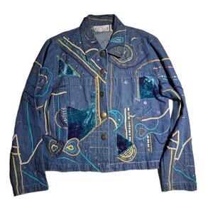 Vtg 1990s Sara Studio Blue Velvet Patchwork Embroidered Denim Trucker Jacket XL