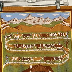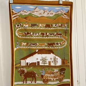 Vintage 1991 Calendar tea towel with European scene of cows being herded up mountain