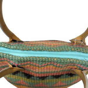 This colorful woven tote bag features sturdy leather handles, a secure zipper closure, and a spacious interior. Ideal for carrying daily essentials. Colors are green, coral, peach , dark gray and metallic gold. Leather is a tan color.