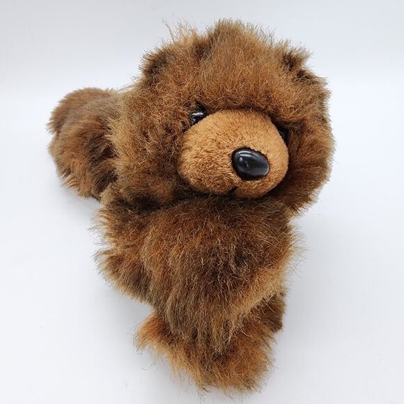 90s brown bear plush laying flat on its belly, vintage 90s stuffed bear animal, childhood nostalgia, security, soft, plushy, squishy, packable, replacement plush, kids replacement stuffed animal, cuddle plush, cozy soft toys
