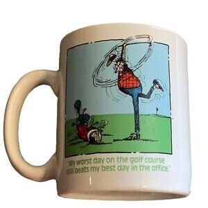 This vintage 1992 golf mug by Golf Gifts Inc. is crafted from durable white ceramic and features a humorous golf cartoon. Ideal for golf enthusiasts.