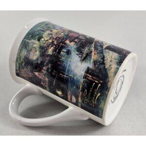 Tall ceramic coffee mug with a print along the sides of Lamplight Village by Thomas Kinkade depicting a beautiful historical scene with the old buildings, the old curved stone bridge over peaceful water and plants. Mug has thin sides and is lightweight, great alternative to standard mugs. In good condition.