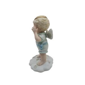 This beautiful vintage porcelain figurine is a must-have for any collector. Created by artist Katherine Stevenson, this hand-painted figurine features a charming angel with glitter accents and a textured finish. Perfect for any room in your home, this small figurine measures 2.5 inches in length, 2 inches in width, and 4 inches in height, making it a great addition to any collection. The figurine is signed by the artist and is part of the Tender Hearts collection by Bronson Collectibles. It was manufactured in 1995 and is in excellent condition. This multicolor figurine is perfect for all occasions and is sure to bring a touch of angelic charm to any space.