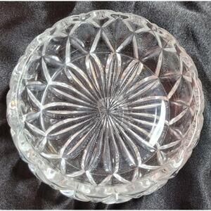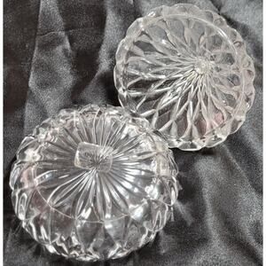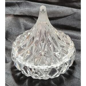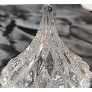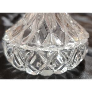Beautiful vintage clear glass trinket box by H.F.C., dated 1996. Features a classic diamond-cut pattern with a teardrop-shaped lid. Stands approximately 3 ½ inches tall including the lid. Perfect for storing jewelry, small keepsakes, or candy. Lovely sparkle under light—ideal for vanity decor or as a collectible glass piece.
