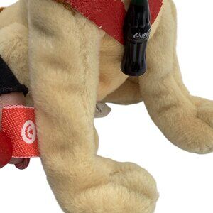 This collectible Coca-Cola plush dog features a soft beige body, a red collar, and an adorable miniature Coke bottle accessory for display.